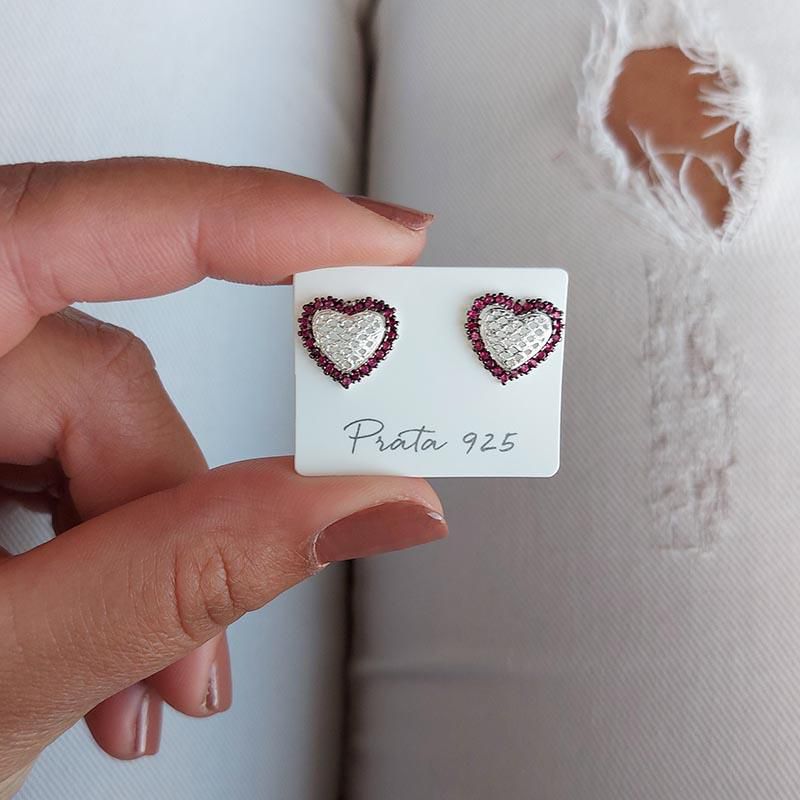 BRINCO EM FORMATO DE CORAÇÃO TEM SUA BORDA TODA CRAVEJADACOM MICROZIRCÔNIAS COR DE ROSAS, E SEU PREENCHIMENTO SEMELHANTE A UMA RENDA XADREZ VAZADA