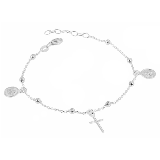Pulseira de Bolinhas Confeccionada em Prata de Lei 925 com pingentes de cruz e medalhas