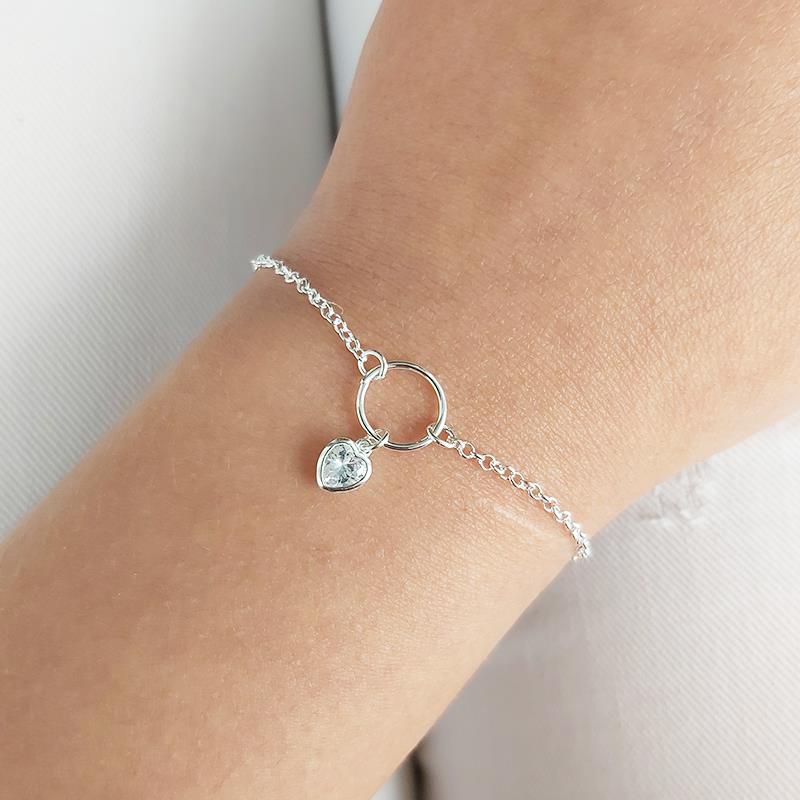 PULSEIRA COM UM CÍRCULO E NO MEIO UM CORAÇÃO PONTO DE LUZ, TRABALHADA COM ELOS PORTUGUÊS